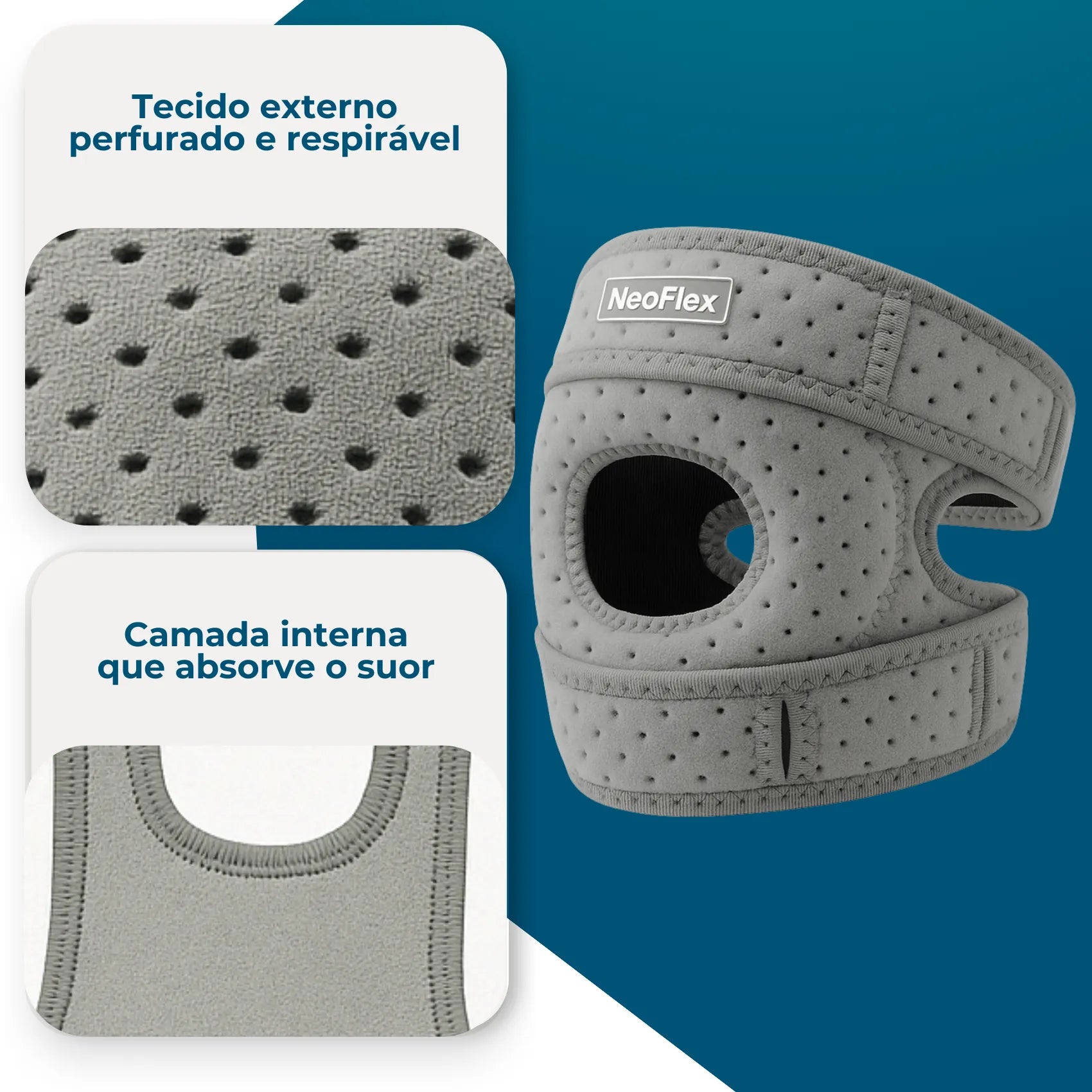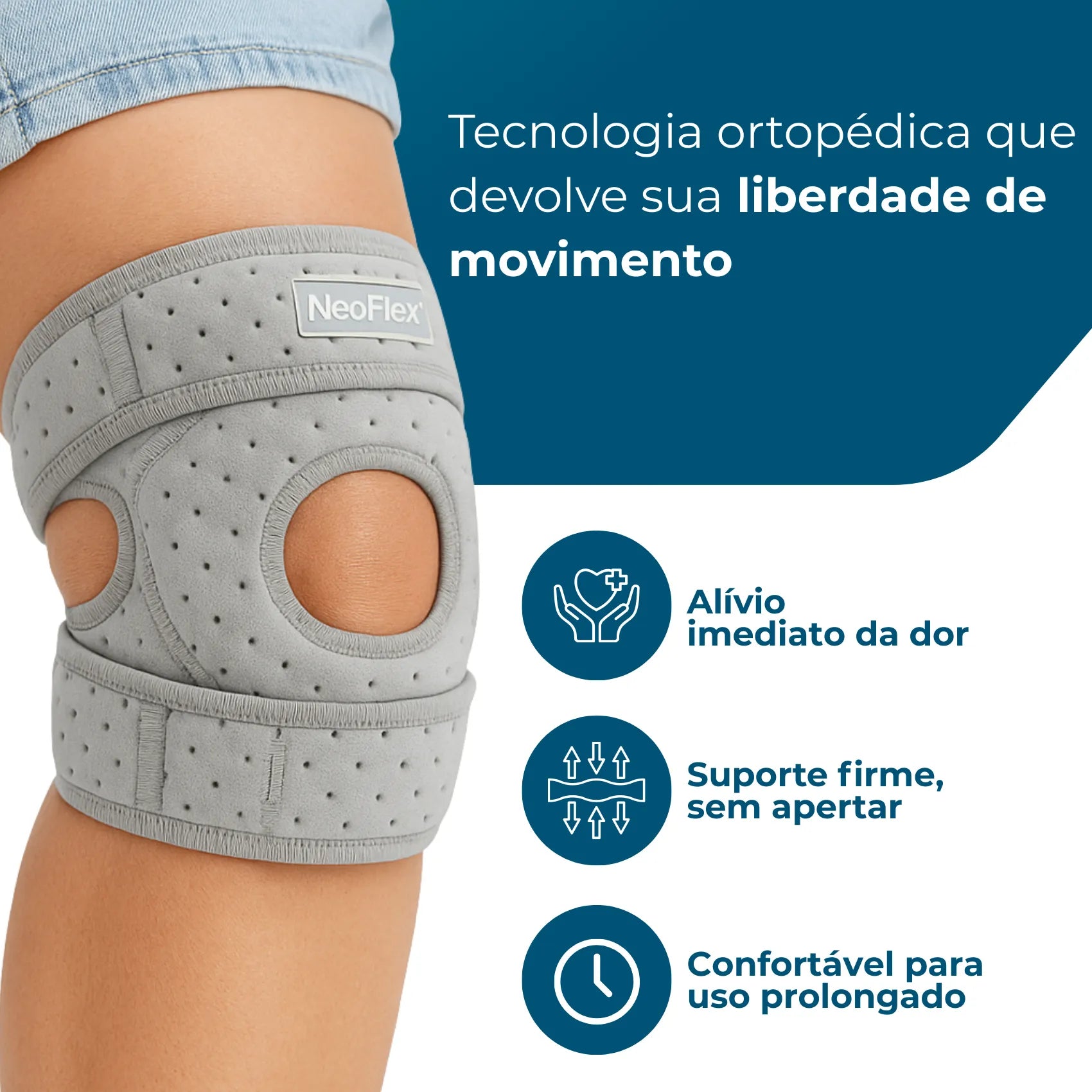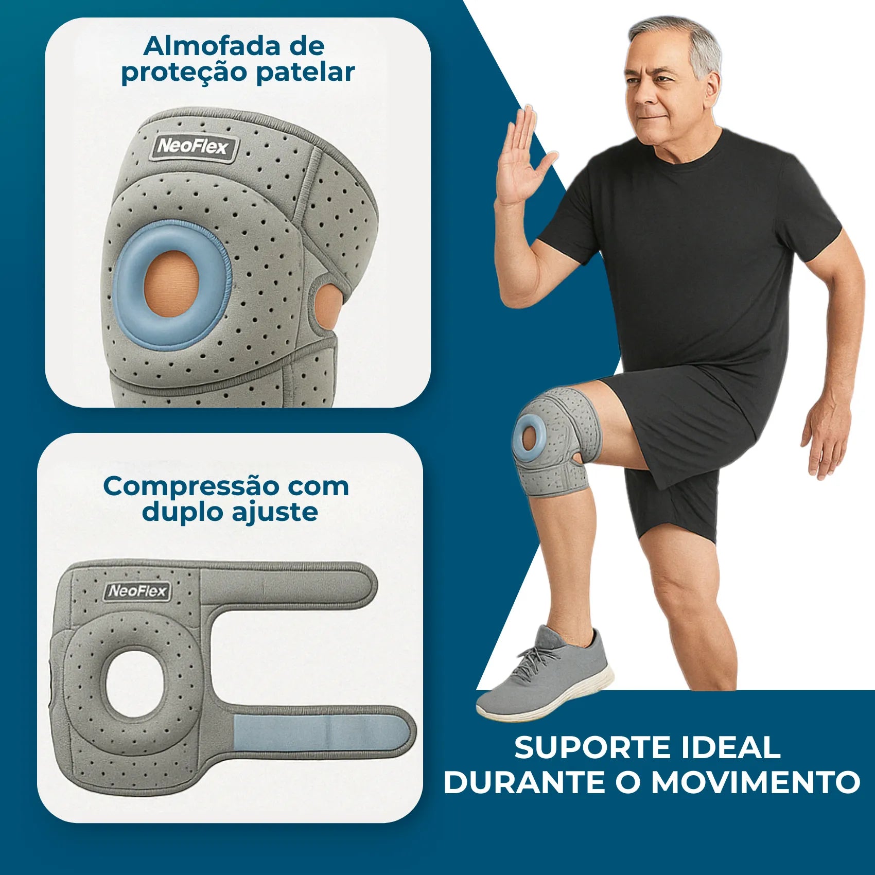 A NeoFlex é feita com tecido respirável, elástico de compressão inteligente e suporte interno de silicone para patela, que estabilizam a articulação e sem desconforto.